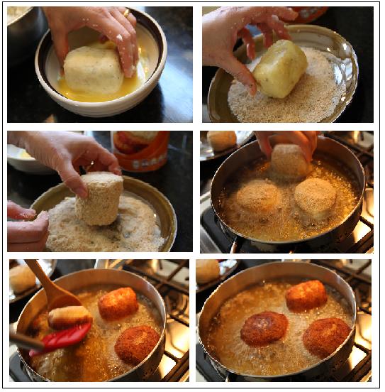Then make the mashed potato dough …. Peel the boiled potatoes, and in a large bowl, mash it with about a ¼ cup of bread crumbs. Season with salt. (The bread crumbs in the mashed potato allows it to bind and not crumble as easily).