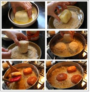 To shape the Shogo Shabril, take a good size portion of the potato dough, flatten it out in your palm, add a spoonful of the meat filling and gently close the dough around the filling – shaping it with your hand. You can shape them in the traditional barrel shape or the easier way is just to make a flattish round shape. Once done, dip this in the egg mixture, coating it completely and then roll it in the bread crumbs. Now its ready for final step – deep frying. (I like to prepare all the dough before starting to deep fry since you have to keep a close watch while deep frying).