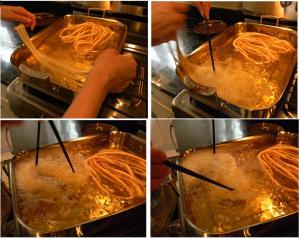 When the oil is hot enough, start by dipping the center of the strands in the oil, swish it around gently so the strands separate, and then let one end down into the oil. Using a long chopstick, separate the strands, hold it in place and then fold over the other end onto the oil, with a little curve. The chopsticks come in handy here to pull and fold the strand over. Let it get golden brown and your Senz is ready.
