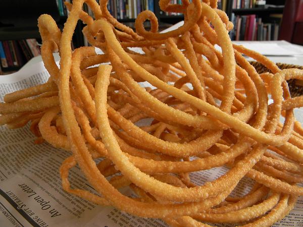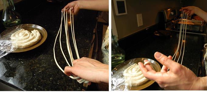3. Now is the fun part. Heat the oil for deep frying in a large deep container, and start preparing the Senz. Take one long piece of dough and start rolling and pulling like you are making long noodles, keep pulling and twisting the strands around like a wound up strand of wool.
