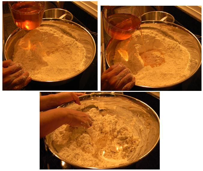 2. Prepare the dough with this Emma water. Add the salt to the flour (add one egg if you are like it softer). Slowly mix the flour as you add the liquid. The dough consistency should be supple, not too firm and not too soft. The kneading is very important and the more you knead the better it will be.