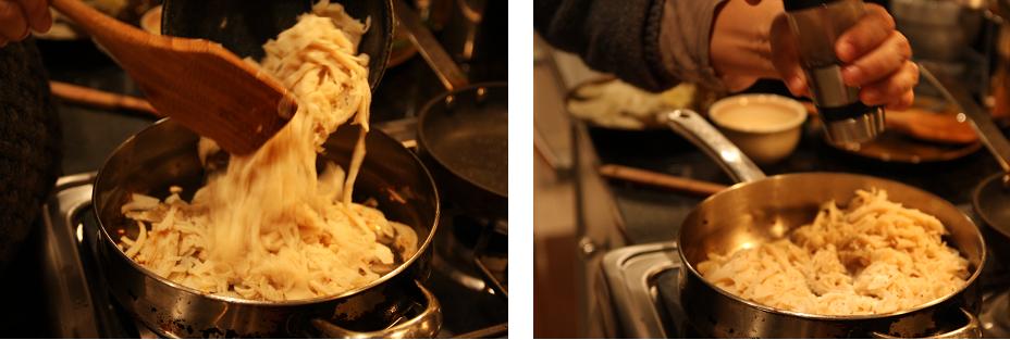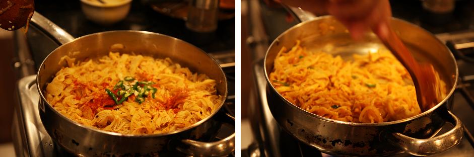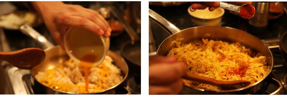 Next add the turmeric mixed with water, add salt and pepper to taste, continue frying 1 minute longer.