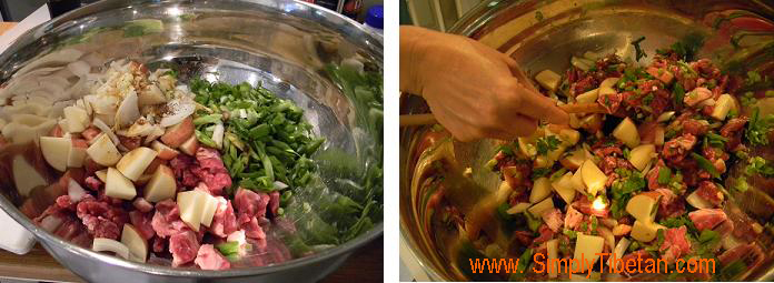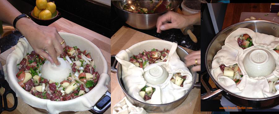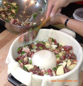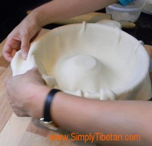 This is one dish that I’ve heard about and been intrigued by, but had no idea how it was made. I’ve had many a conversation about this strange giant Momo that takes up a whole steamer, and is filled with meat and potatoes. I couldn’t quite figure it out and it’s remained on my “find out” list for a long time – especially since my husband talks about it so fondly. He had eaten it when he was very little and remembers that it was a huge Momo and that it was quite delicious. He thought it was a dish from Amdo. But my Amdowa friends told me, that there is nothing like that in Amdo. Then one of my Khampa friends told me – “Oh! It must be the Bathang momo you’re talking about. It’s delicious.” But he didn’t know how to make it. Then another friend said, “I remember we had a Khampa Rinpoche in our home once and he made this for us. He put meat, potatoes, and spices and wrapped the whole thing in dough and steamed it in a big steamer.” That sounds simple enough but doesn’t quite explain how it’s made. I was determined to keep asking around to figure out how to make this dish and it was to my utter delight, that a video of the making of this dish was posted on Lhakar Diaries by Pema Yoko. That’s when I learnt that it is called “Terro.” And the following weekend, I followed the cooking technique on the video and made it for our dinner. It turned out really quite delicious and was quick & very easy to make, but next time round, I will add more meat and less potatoes!! I share my recipe here.