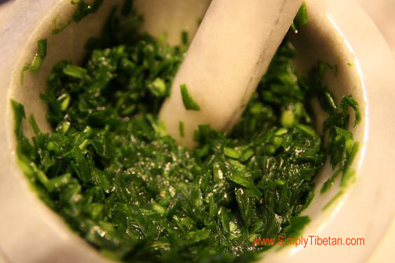 Take a small bunch of chives, chop them up into small manageable size. Then put them in the mortar & pestle. Crush and grind until it forms a nice paste. Take this out in a small bowl. Add a dash of salt. Heat a small amount of oil and pour the hot oil over the chive paste – it should sizzle and the chive will turn a beautiful bright green color.