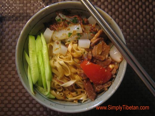 In preparing Drang-thuk, the most important things are the condiments and most families have their own style of preparing these condiments. In our home, we prepare Gogpa (a garlic dressing), and Tsong-qa (fried onions) – sometimes, I also make a chive dressing, and of course hot sauce, soya sauce and siling tsu (chinese rice wine vinegar). The condiments are left on the side for each guest to add according to their taste. With the cold noodles, we’ll usually serve Shaptak (stir fried beef) or phagsha (stir fried with some veggie), Lephing (Mungbean gelatin), veggies or a salad.