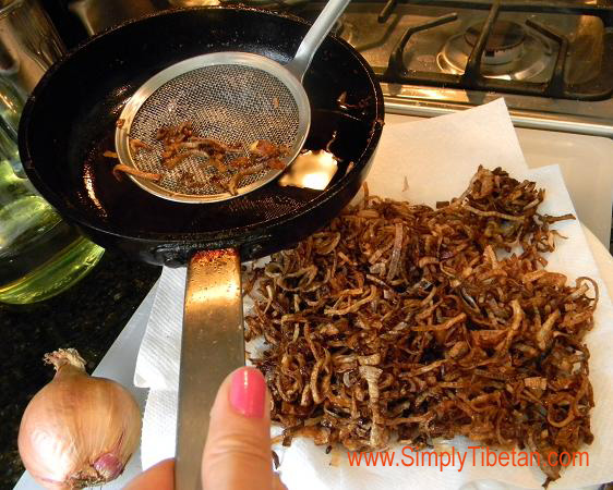 Heat a ¼ cup of oil in a small pan – to deep fry the onions in small batches.