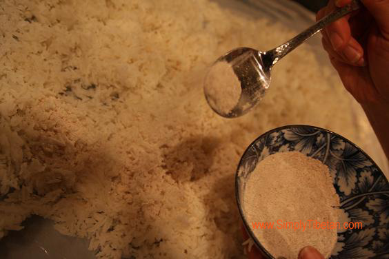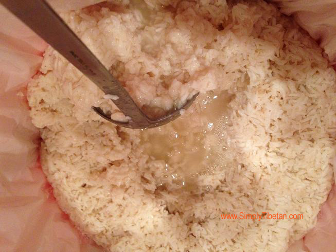 Once the rice has cooled a little but still warm to the touch, sprinkle the yeast and tsampa mixture evenly over the rice and mix it really well. The rice is sticky and will have a tendency to lump up, so gently scoop with your hands and gently mix it all up.