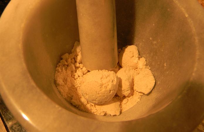 While the rice is cooking, grind the yeast balls really well in powder form in a mortar & pestle.