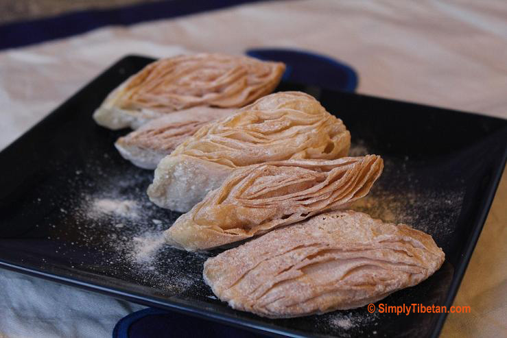 But back to food, there are a couple of different types of Sangha Bhaley but the most commonly made ones in Tibetan homes are those scrumptious, delicate ones with dozens of paper thin layers topped with a sugar coating. I’ve tried to learn how to make these from a number of friends but have never been able to perfect the craft. These cookies are quite delicate and require some precision cooking. The best ones in our area come from our friend Thupten Tsering la’s kitchen and I was truly delighted when he accepted my invitation to share his recipe on Simply Tibetan.