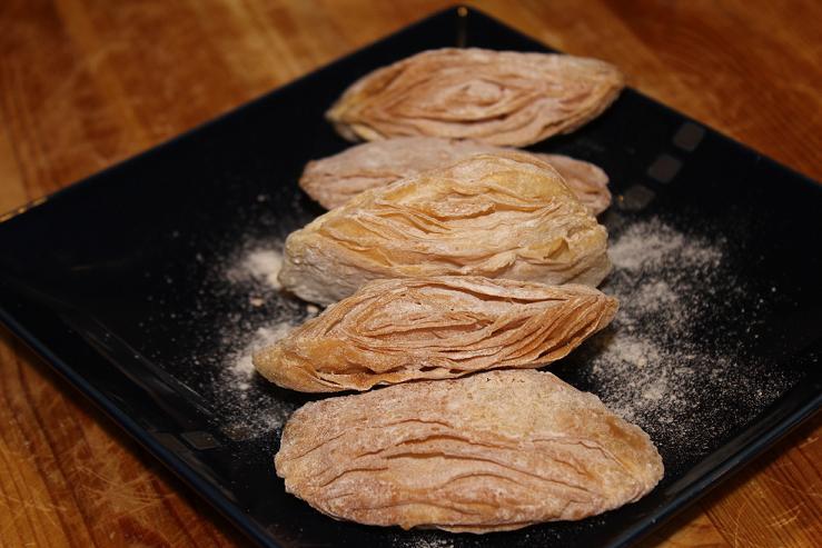 The perfect Sangha Bhaley has multiple layers of paper thin pastry and is so crisp and that it falls apart as you bite into it. (The only comparison I can think of is biting into a layers of chips piled up together). The proper etiquette to eating Sangha Bhaley is to hold the palm of one’s free hand under the mouth as one takes a bite – in order to catch the sugar powder and crispy bits that fall off the side as you bite into the cookie.