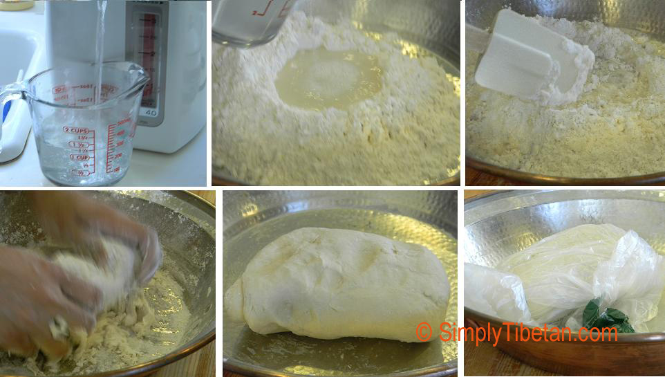 Put the flour in a large bowl, slowly add hot boiling water stirring with a ladle mixing in the water to form a dough. Once the dough is formed, slowly handle it with you hands – it’ll be hot but gently start adding a little pressure and knead for a few minutes until it is the consistency of momo dough – not too dry but smooth texture. Cover and let sit.