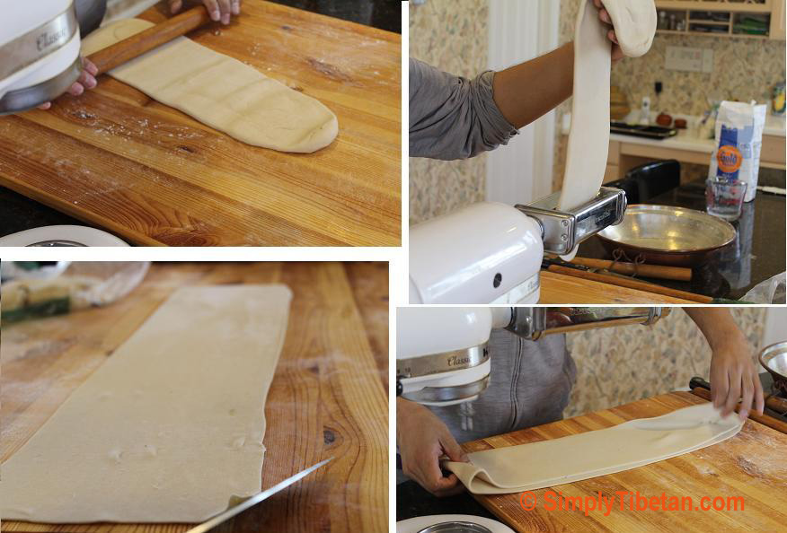 With Noodle maker: Flatten the dough and run it in the Noodle maker to form a long thin flat dough. With TT’s machine, we started at #1 and stopped at #3 setting. Cut it into about 20”to 22” strips.