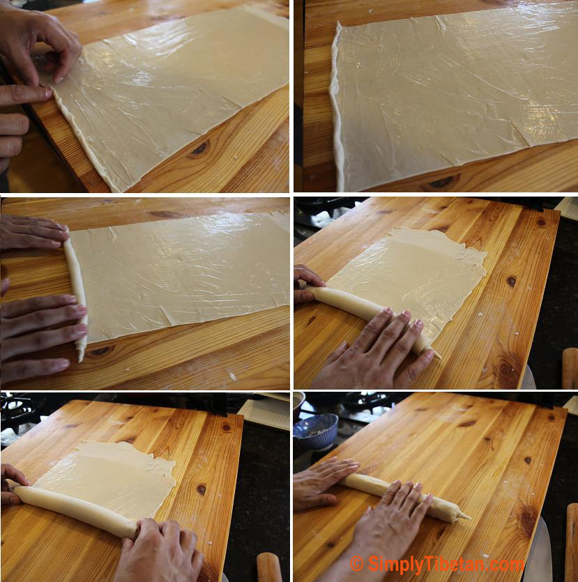 Manually on a Kneading Board: Roll out the dough as big and thin as you can make it – lightly dusting the surface with flour helps if the dough sticks. Roll the dough till its about 22 inches long to about half the width. Slice of the rough edges along the side to make a long rectangle.